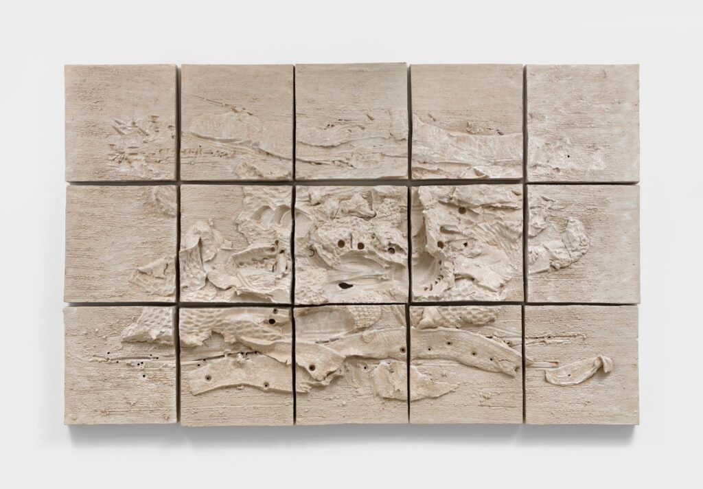 Almine Rech’s two-person show, Erik Lindman & Augustus Thompson: Slabs and Boards evidences that the connective tissue between the two artists’ sculptures consists in the subtending quadrilateral plane, which Lindman and Thompson instrumentalize in dichotomous modes. Lindman tiles his rectangular surfaces with square trestles that cradle his deliquescent protrusions. Their caliginous folds and recesses, built out towards the viewer’s perceptual field, rake a soft dance of suety shadows along the orthogonal substrate below. Reminiscent of macramé designs, Lindman’s gray honeycombed forms wend in and out of the modular platform. Such is the case in the spiraling scale furrows of his well-executed Ryggen (all works 2025), whose polysemous title at once refers to the Danish word for “back” and the Norwegian-Swedish textile artist, Hannah Ryggen (known for her figurative woven tapestries). Ryggen’s kneaded silvery emulsions, which resemble an overwalked marshland’s ashen gley, are suspended in a six-part vertical grid.